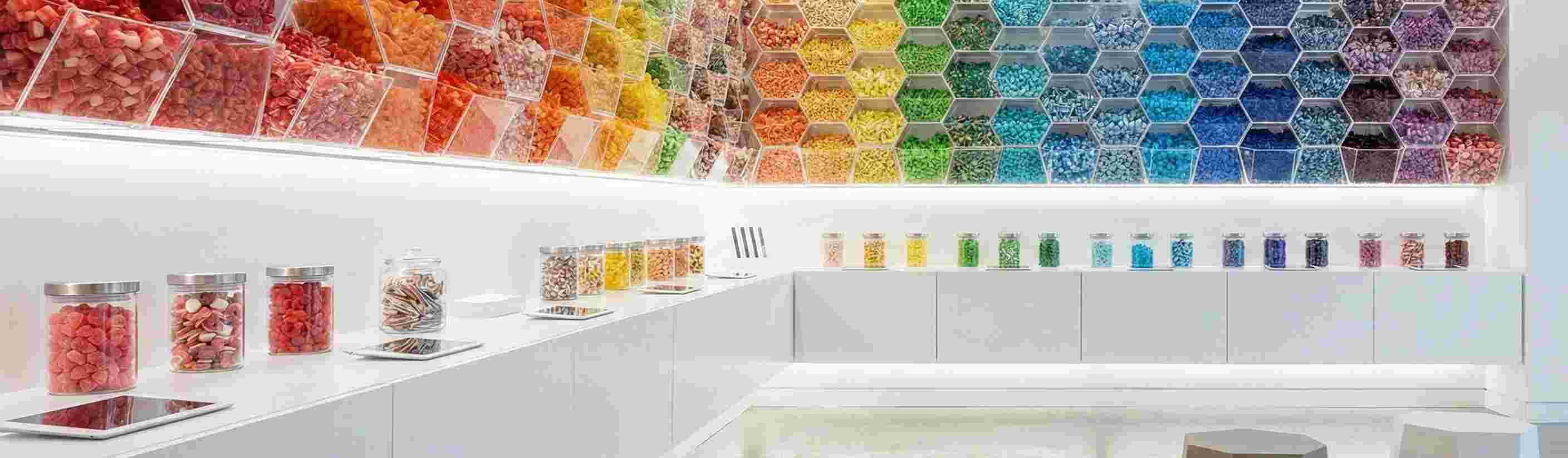 יצירת "קיר כוח" (Power Wall) של ממתקים מרצפה ועד תקרה יוצרת אפקט ויזואלי עוצר נשימה שמושך לקוחות פנימה, ומאפשרת להציג מאות מוצרים על שטח רצפה מינימלי.
